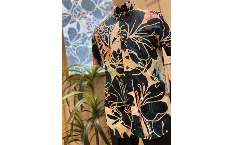 ムツウサのお花が可愛い優しい印象のかりゆしウェアです。ゆったりとしたドルマンスリーブなので